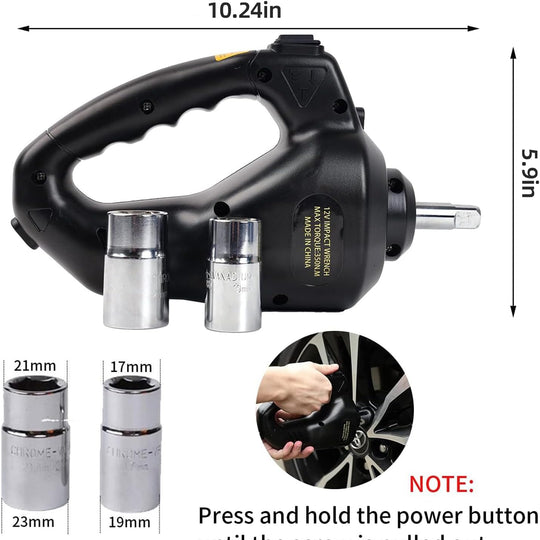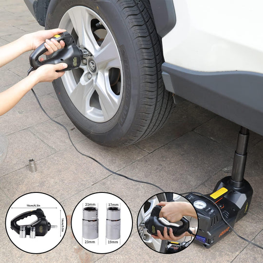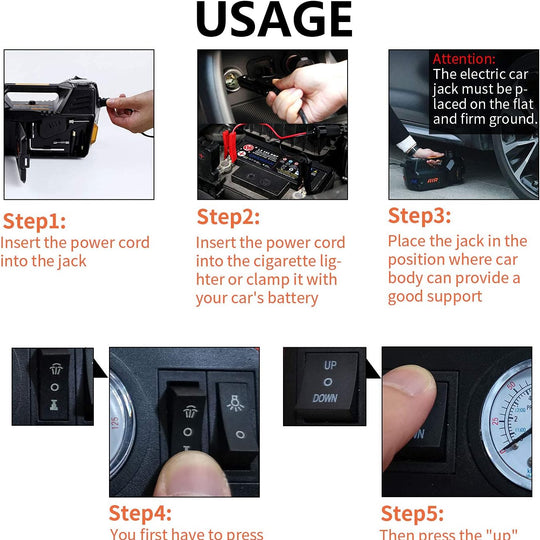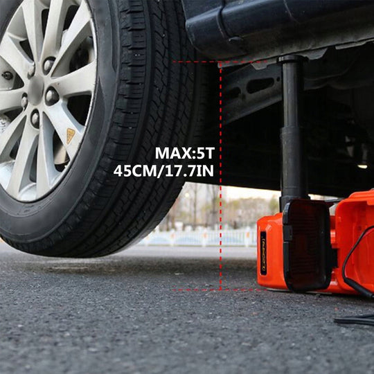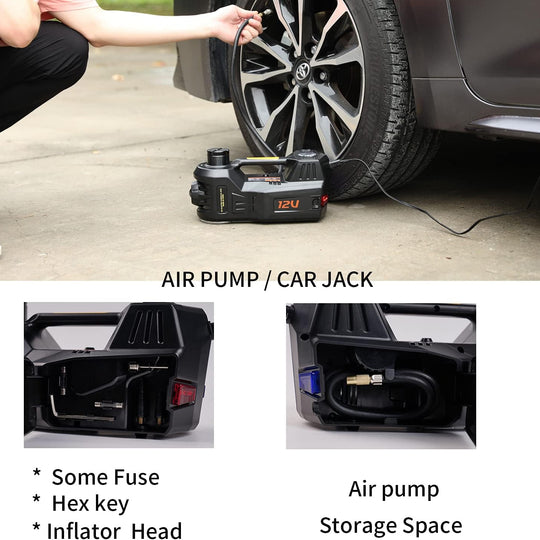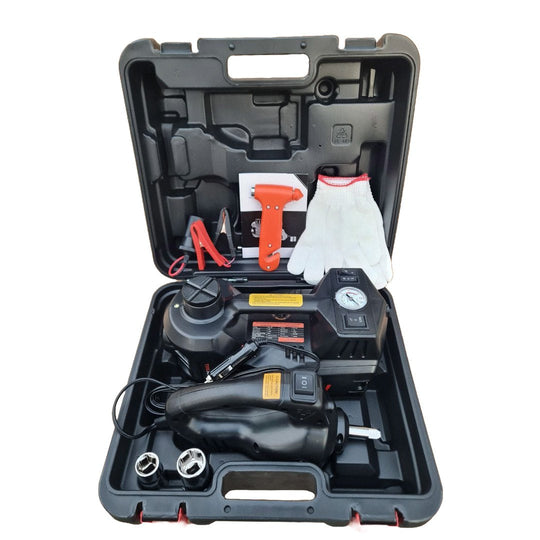 un cric hidraulic electric de 5 tone, o cheie de impact electrică 12V și un compresor auto puternic – totul într-o cutie compactă și portabilă, ideală pentru drumuri lungi sau situații de urgență.