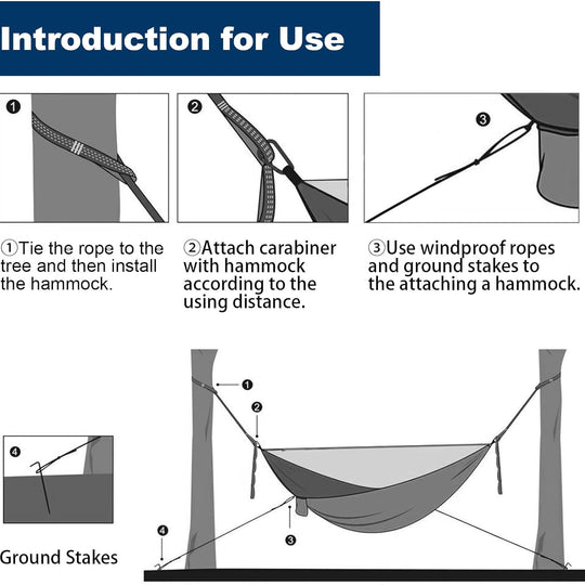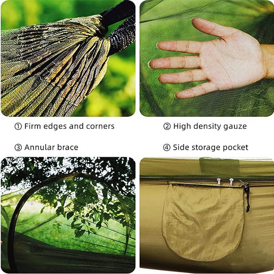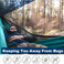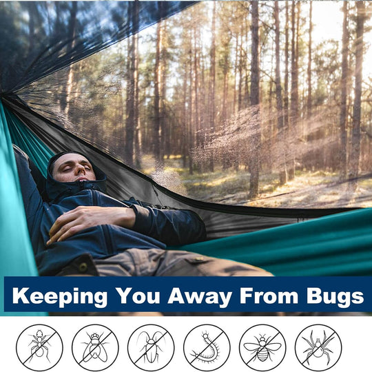 Hamacul este prevăzut cu plasă de țânțari integrată cu fermoar dublu pentru deschidere din interior și exterior. Te bucuri de un somn liniștit, fără insecte!