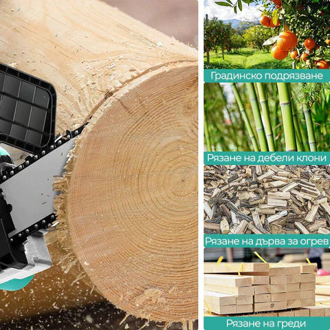Новият немски акумулаторен верижен трион e захранван с мощна батерия от 36v, която издържа до 320 рязания преди да се зареди отново. Закалената верига и дългата шина позволяват рязането на дърво с диаметър 20см с лекота. Той е високоефективен и с ниско ниво на шум при работа. Меката ръкохватка предпазва от приплъзване. Има регулируемо автоматично смазване на веригата. Индикатор показва нивото на заряд на батериите. Веригата се настройва и опъва безпроблемно и не е необходимо да разполагате с инструмент. Спирачката се активира с помощта на предния предпазител за ръката. Ниското ниво на шум прави инструмента подходящ за използване на обществени места или в жилищни комплекси. Удобната предна ръкохватка и ергономичният корпус идеално пасват на ръцете на потребителя и са подходящи за работа с една ръка. Осигуряват по-голям комфорт и ефективност по време на работа с инструмента. Трионът пристига в комплект с два броя вериги и батерии. Подходяща е както за любители, така и за професионалисти!