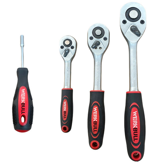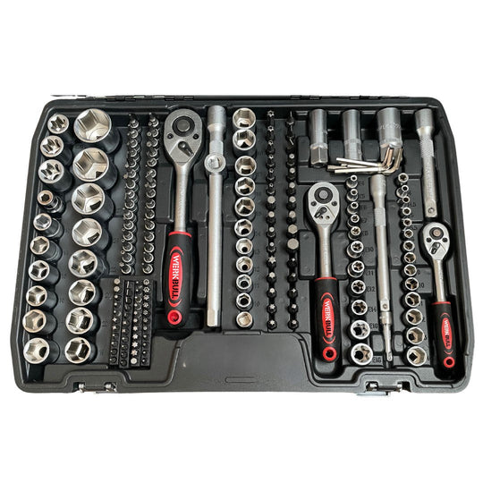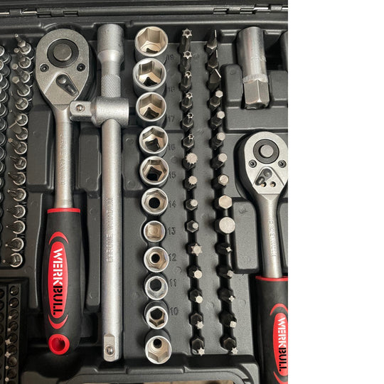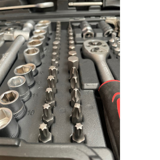 Качествен немски комплект от инструменти с усилени тресчотки,включващ всичко необходимо. Изработени от качествена хром-ванадиева стомана. Удобен за съхранение куфар, в който всичко ще седи на мястото си.