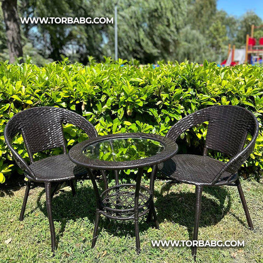 Лесен за поддръжка, той съчетава простотата на минималистичен дизайн, издръжливост и функционалност, за да се избегне подмяната му възможно най-дълго поради променящите се тенденции в дизайна. Комплектът се състои от ратанова кръгла маса с поставка отдолу, покрита със стъклен плот, и 2 ратанови стола, които предлагат необходимия комфорт, за да се чувствате спокойно във всеки момент, прекаран на открито.