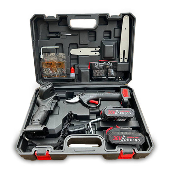 Setul 2 în 1 WerkBull combină două scule esențiale pentru îngrijirea viței de vie, a pomilor și a grădinii tale – o foarfecă electrică de tăiat viță de înaltă precizie și un mini fierăstrău cu lanț portabil, ambele alimentate de baterii puternice Li-Ion 36V / 8Ah.