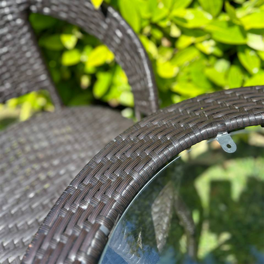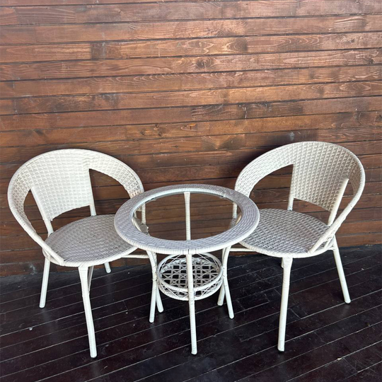 Setul include două scaune ergonomice și o masă rotundă din sticlă securizată, cu suport inferior practic – perfectă pentru cafeaua de dimineață, o carte bună sau discuții plăcute în aer liber.