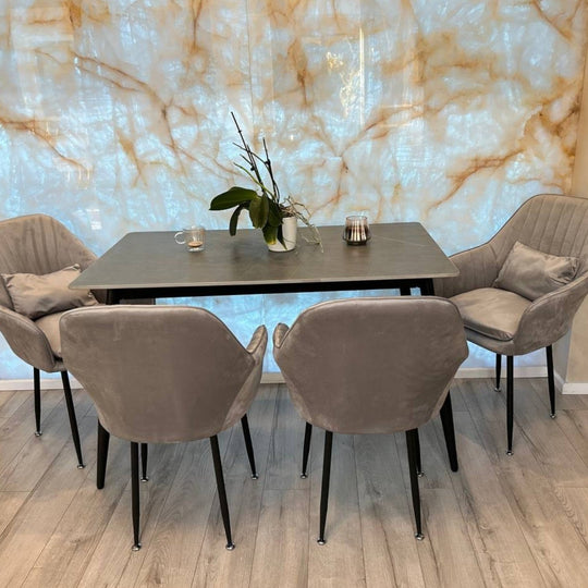 - Плот: Изработен от висококласен синтерован камък с дебелина 12 мм, устойчив на надрасква надрасква надраск температури. Матово сивото покритие добавя изтънченост и модерен вид.